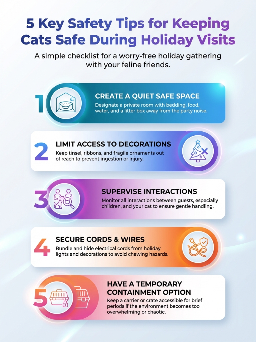 On the Gold Coast and in other high-density areas, many of us want outdoor time for our cats without full roaming. Cat-contained yards using paddle systems allow that freedom while still respecting council containment rules and keeping wildlife safer. You still gain a social outdoor area for guests, but you do not have to choose between cat safety and a relaxed open-door summer party.Quick, practical safety tips to keep your cats safe during holiday visits. This infographic highlights 5 key steps for a smooth, cat-friendly gathering.