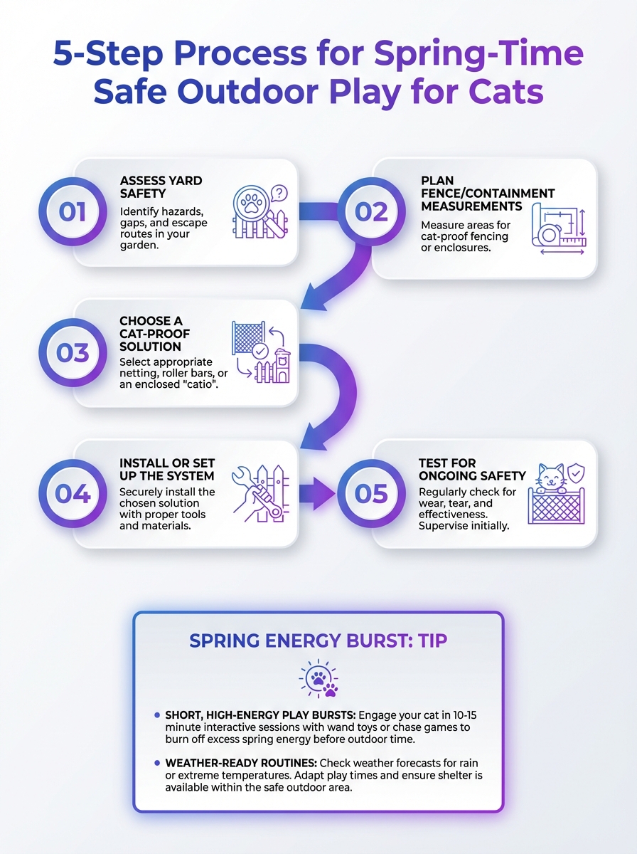 A visual guide to channeling your cat's spring energy into safe outdoor play. The 5-step process helps keep cats engaged and protected.